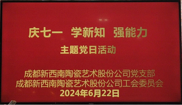 为庆祝中国共产党成立103周年,中共成都新西南陶瓷艺术股份公司党支部联合公司工会委员会,近日在公司展厅会议室成功举办了一场主题为“庆七一、学新知、强能力”的主题党日活动。此次活动旨在回顾党的光辉历程,坚定理想信念,提升党员及党建积极分子的业务能力,加强党支部的凝聚力和战斗力。