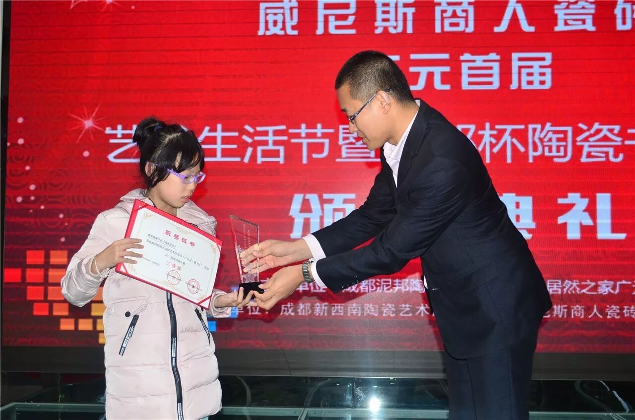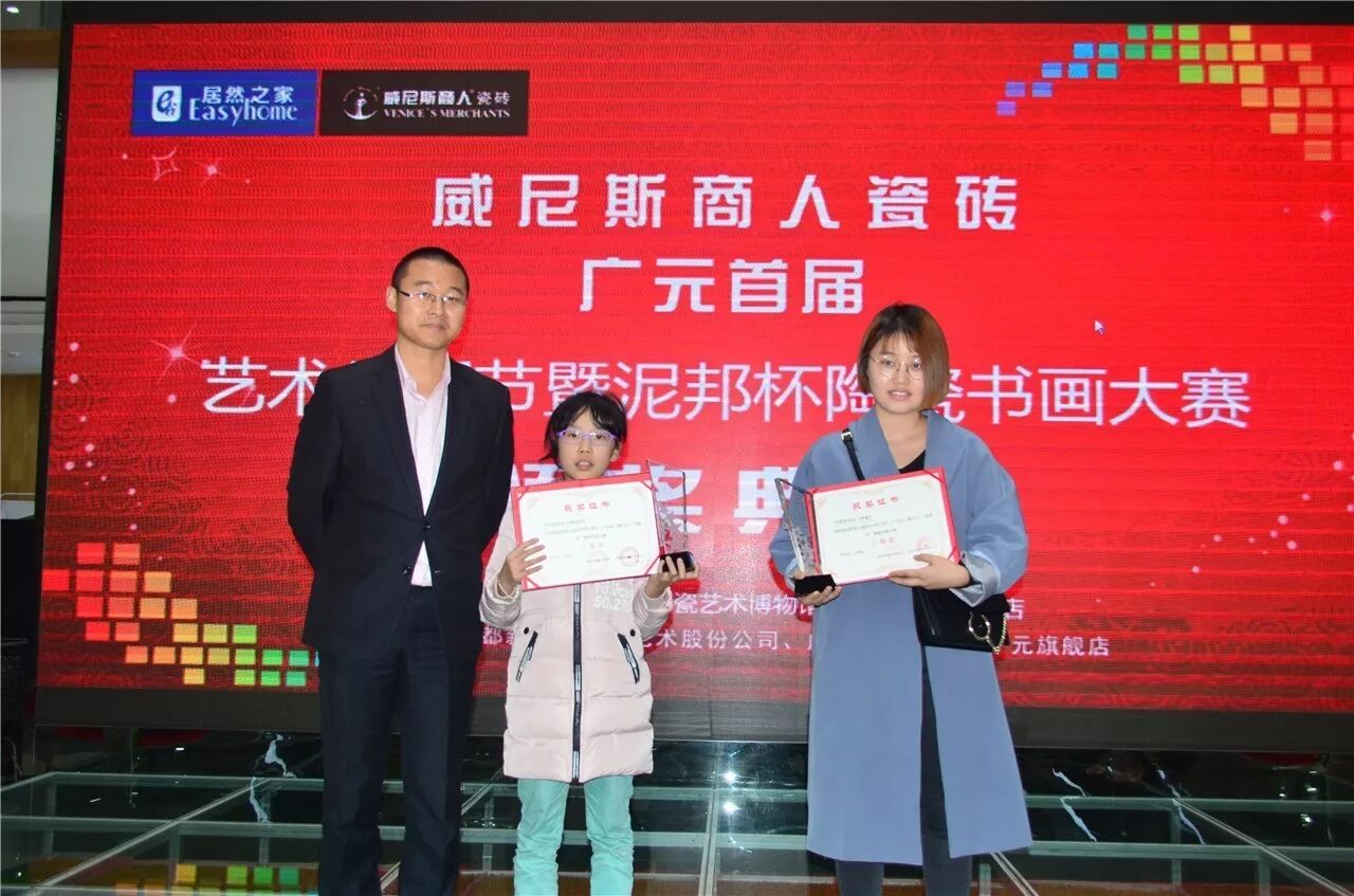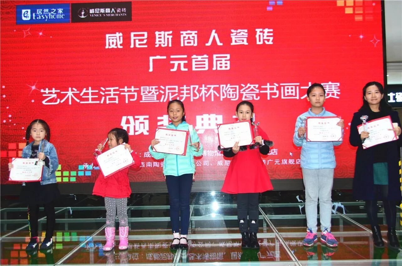 、成都新西南陶瓷艺术股份公司营销总监赵强,威尼斯商人瓷砖广元店以及邀约参赛的家长和小朋友们参加本次颁奖典礼。