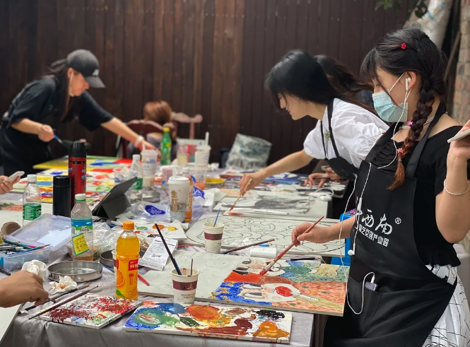 经过前一天的绘画,大家对于瓷板画更加得心应手了!一位女同学说,我们专门搬到那边的小木桌上画,在这样的环境下创作,更有灵感了。