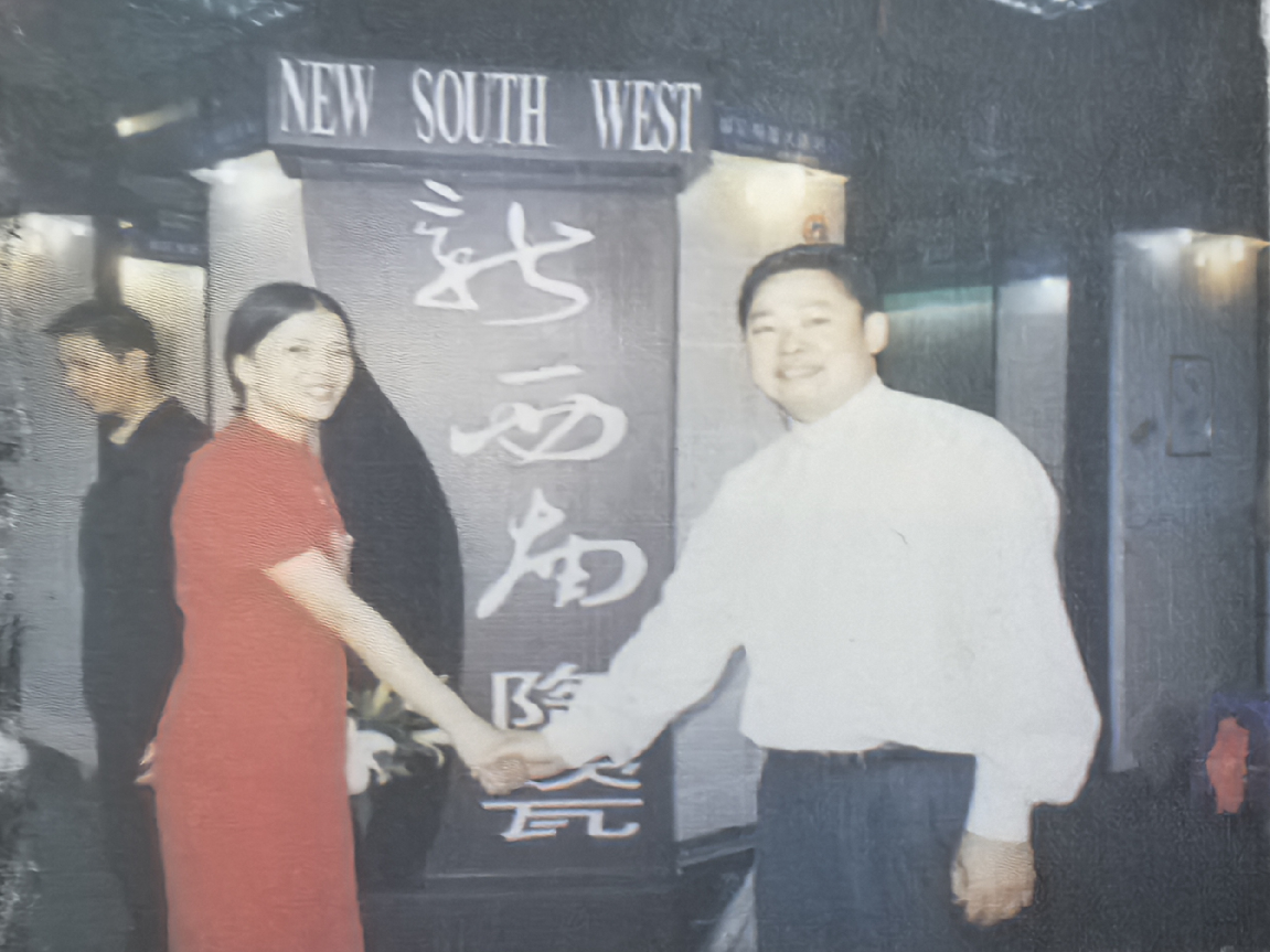 2000年新西南陶瓷江安加盟店开业。新西南陶瓷公司总经理徐素勤(左)与江安店田总握手祝贺。