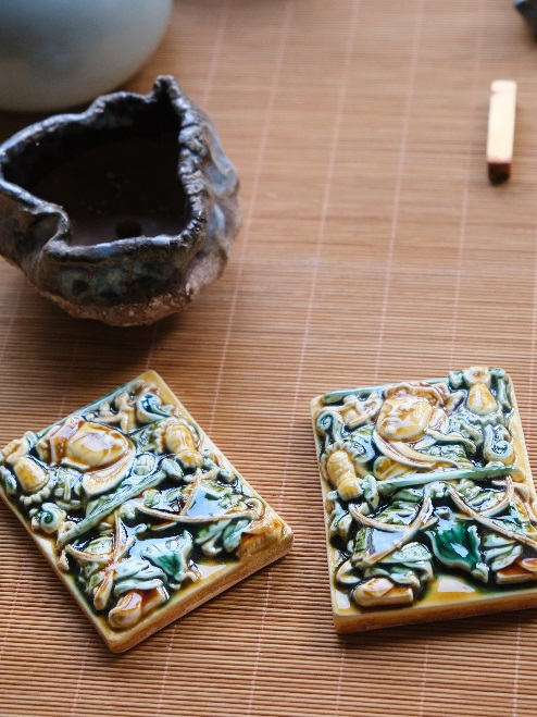 产品巧妙融合了邛窑蜀三彩的独特工艺和彩绘技术,以浮雕的形式生动呈现秦琼与尉迟恭的形象。色彩斑斓、层次分明,既展现了古代陶瓷艺术的精湛技艺,又赋予了产品独特的艺术韵味。