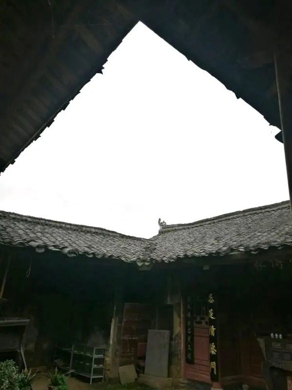 再进去是第三个天井,这个天井有个特殊的布置,中间有几个平时不用的石蹬,只在族中子弟考上功名后开中门,由此径上堂屋向祖宗报喜。整幢建筑最高大雄伟的是堂屋,平时族长要维持堂屋庄严、肃静和神圣,在堂屋内不得堆放粮食、柴草、棺木及其他杂物,不得让人借宿,不得让工匠在此作工,更不能租赁他人和赌博。堂屋进深不仅大于下厅和中厅,也大于左右两侧的房间,达1丈8尺(约5米)以上;最高处的主梁离地也为1丈8尺以上,粗大,涂作红色,上有雕龙画凤和一些吉利话;往下有一条特殊的拱梁(也称衬梁),弯成扁担形,中间支撑点顶着横梁,用于挂大油灯。