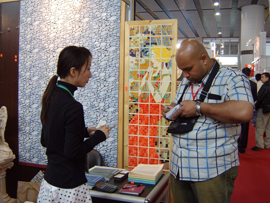 【上图拍摄于2004年8月14日广交会新西南陶瓷展位,海外客商定制珐琅邛彩手工陶瓷。中间金发红裙壁画为珐琅邛彩工艺制作】