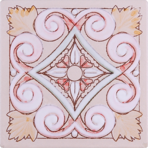 标准的漩涡纹组合装饰纹理。心型结构的漩涡纹连续围绕着四方形的花萼周边组合成封闭的环形,四角有棕榈叶装饰。古希腊柱式之一的爱奥尼亚柱式的柱头就是漩涡卷纹。纹理呈偶数对称,四方连续,浅粉色的釉面散发谈谈的依恋,那是对梦想的憧憬,放置家中,梦想再次被点燃。温馨、浪漫是优雅女性对生活的永远的梦幻。