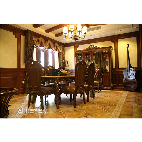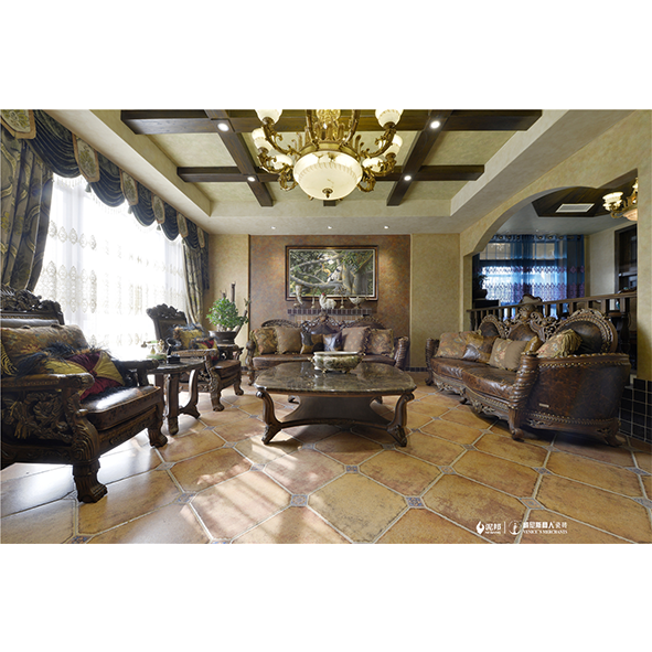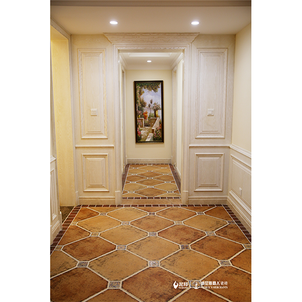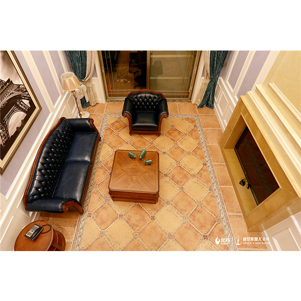 瓷砖砖面为八角残边造型。不同饱和度的黄与黑两种色彩相互融合,在高温的作用下形成了三款油画般的色彩,艺术美与自然美的结合给人以典雅、庄重、华丽的贵族气息。