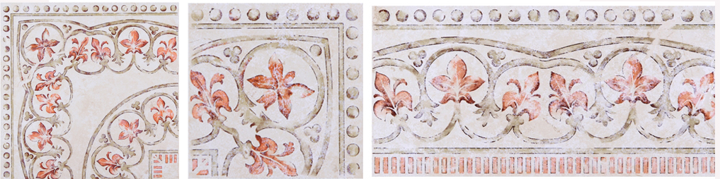 本款产品采用的设计手法采用的是连珠纹和凌霄花纹的组合搭配。整个配套设计分为花线、转角、中花三大部位。在设计手法上,花线、转角、中花三大部位都采用了连珠纹作为边框装饰,值得注意的是每个部位运用的连珠纹数量都是"九"的倍数。