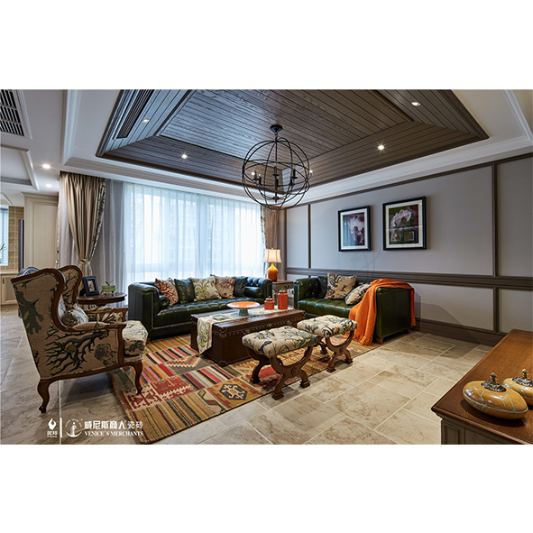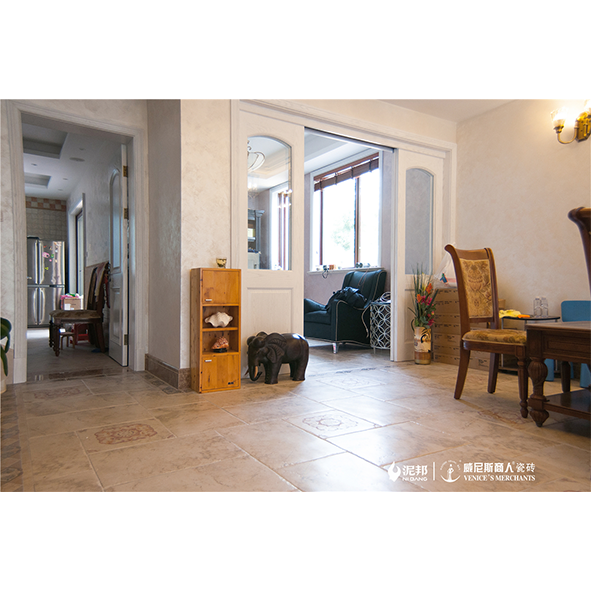 威尼斯商人瓷砖,"优雅意大利"系列产品纹理取自意大利天然石材,纹理自然,色彩柔和,采用三维数码雕模、无序胶滚等工艺生产,形成了自然逼真的残边效果,具有强烈的乡村自然风格;主色调以灰白为主,素雅底调,表现的是一种不经意的美和低调的华丽,是对意大利味道的完美诠释。